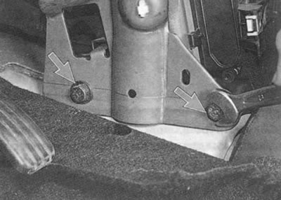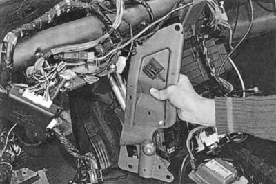 3. Пад панэллю прыбораў адагніце бок кілімка падлогі і вывярніце два ніта мацавання ўзмацняльніка папярочкі панэлі да падставы кузава.