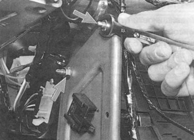 5. Праз акно ў панэлі прыбораў, якое адкрылася пасля зняцця камбінацыі прыбораў, адкруціце дзве гайкі верхняга мацавання ўзмацняльніка папярочкі панэлі прыбораў...