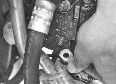 8. Вывярніце балты мацавання помпы гідраўзмацняльніка рулявога кіравання(гл. "Замена помпы гідраўзмацняльніка рулявога кіравання"), трубаправод і шланг ад помпы не адлучайце.