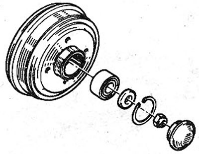 3. Выпрасуйце падшыпнік з тармазнога барабана, усталяваўшы на яго невялікі адрэзак трубы 1 падыходнага дыяметра (гл. ілюстрацыю).