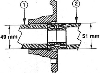 5. Запрасуйце падшыпнік ступіцы з дапамогай прэса і невялікага адрэзка трубы 2 у тармазны барабан да ўпора ў выступ ступицы (гл. ілюстрацыю 15.3).