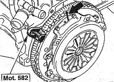 3. Застопарыце махавік адвёрткай, мыслікам або адмысловай прынадай Mot 582 FACOM, замацаваўшы іх на зубчастым вянку махавік (гл. ілюстрацыю 2.2). Крапежныя ніты націскной кружэлкі саслабляйце паслядоўна сябар за сябрам кожны раз на адзін - паўтара абарачэння датуль, пакуль пасадка кружэлкі не будзе саслабленая і ён будзе стаяць без высілкаў.
