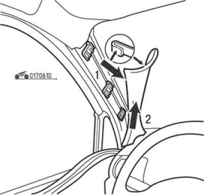 - часткова зніміце ўшчыльняльнік левых дзвярэй і абліцоўванне стойкі праёму ветравога шкла (гл. мал. 6.10);