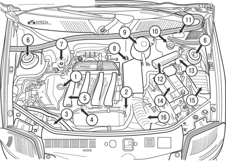 Мал. 2.24. Размяшчэнне агрэгатаў і кропак абслугоўвання ў маторным адсеку: 1 – вечка маслоналивной гарлавіны рухавіка; 2 – маславымяральны мац; 3 – помпа ўзмацняльніка рулявога кіравання; 4 – трос педалі акселератара; 5 – впускной трубаправод; 6 – верхнія апоры стоек пярэдняй падвескі; 7 - рэзервовы бачок тармазной сістэмы; 8 – паветраны фільтр; 9 - пашыральны бачок сістэмы астуджэння рухавіка; 10 – рэзервовы бачок сістэмы гідраўзмацняльніка рулявога механізму; 11 – бачок для вадкасці абмывальніка ветравога шкла; 12 - электронны блок кіравання (ЭБУ); 13 – інэрцыйны адключальны паліўны клапан; 14 - акумулятарная батарэя; 15 - блок засцерагальнікаў; 16 - впускной паветравод