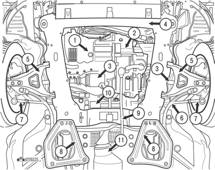 Мал. 2.25. Выгляд пярэдняй часткі аўтамабіля знізу: 1 – зліўны корак паддона картара рухавіка; 2 – скрынка перадач (механічная); 3 – вал прывада перадпакояў колаў; 4 – падрамніку пярэдняй падвескі; 5 – ніжнія рычагі пярэдняй падвескі; 6 - стабілізатар папярочнай устойлівасці; 7 – наканечнік рулявой цягі; 8 – узмацняльнік падрамніка; 9 – шток механізму пераключэння перадач; 10 - рулявы механізм; 11 - каталітычны нейтралізатар сістэмы выпуску адпрацаваўшых газаў