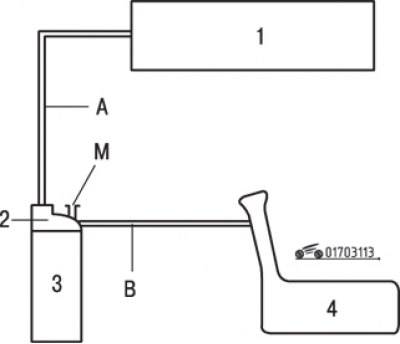 Мал. 3.113. Схема сістэмы ўлоўлівання пароў паліва: 1 – впускной калектар; 2 - электрамагнітны клапан сістэмы ўлоўлівання пароў паліва; 3 - адсорбер; 4 - паліўны бак; М - адтуліна для паведамлення з атмасферай; А, У – злучальныя шлангі