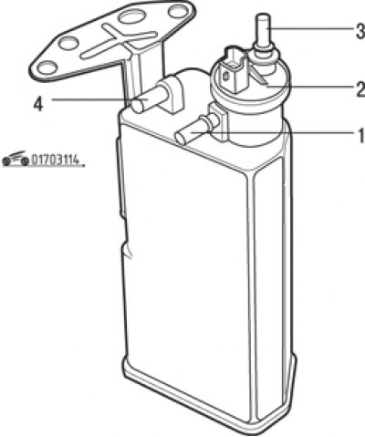 Мал. 3.114. Адсорбер: 1 - трубаправод ад паліўнага бака; 2 - электрамагнітны клапан прадзьмуху адсорбера; 3 – трубаправод да впускнога калектара; 4 - адтуліна для паведамлення з атмасферай