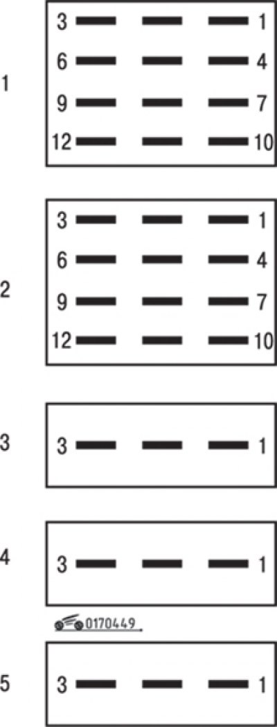 Мал. 4.48. Модульны раз'ём: 1 - зялёнага колеру (шматфункцыянальны перамыкач); 2 - жоўтага колеру (электронны інтэрфейс гідраўлічнай сістэмы); 3 - зялёнага колеру (ціск у лініі); 4 - жоўтага колеру (частата кручэння турбіны); 5 - блакітнага колеру (хуткасць аўтамабіля)