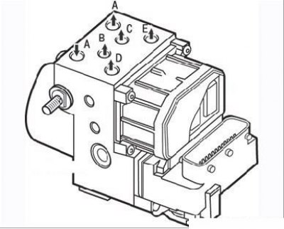 Малюнак 7.35. Падлучэнне трубаправодаў да гідраблока: A - уваход ад галоўнага цыліндру; B - задняе левае кола; C – задняе правае кола; D - пярэдняе правае кола; E - пярэдняе левае кола