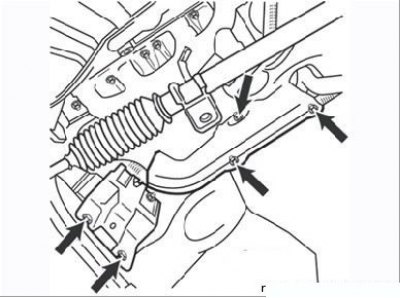 - дзейнічаючы знізу аўтамабіля, адлучыце прыёмную трубу сістэмы выпуску адпрацаваўшых газаў, тры ніта мацавання цеплаізаляцыйнага шчытка выпускнога калектара (Малюнак 7.36) і два ніжніх ніта мацавання кранштэйна гідраблока;