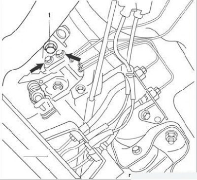 - прыслабце зацяжку ніта 1 (Малюнак 7.11) і адкруціце дзве гайкі нітаў мацавання рэгулятара, паказаныя стрэлкамі. Зніміце рэгулятар з аўтамабіля.