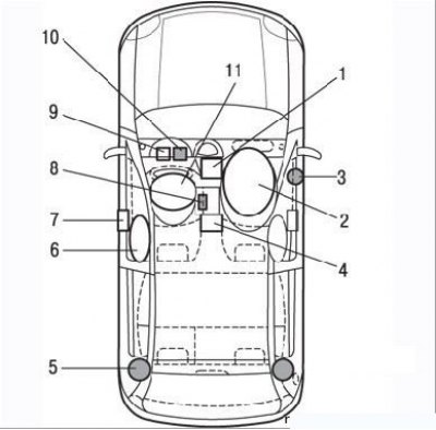Малюнак 2.12. Схема размяшчэння элементаў сістэмы падушак бяспекі і преднатяжителей рамянёў бяспекі: 1 – ЭБУ падушак бяспекі; 2 – падушка бяспекі для пасажыра пярэдняга сядзення; 3 – выключальнік падушкі бяспекі з дапамогай ключа; 4 – праднацягвальнік замка рамяня бяспекі перадпакояў сядзенняў; 5 – шпулька рамяня бяспекі задніх сядзенняў; 6 – бакавая падушка бяспекі; 7 - датчык бакавога ўдару; 8 – датчык становішча сядзення; 9 - кантрольная лямпа падушкі бяспекі; 10 - кантрольная лямпа падушкі бяспекі выключана; 11 - падушка бяспекі кіроўцы
