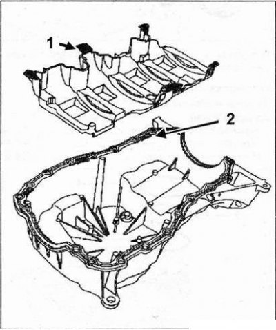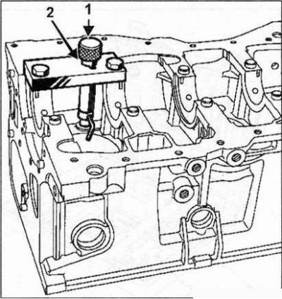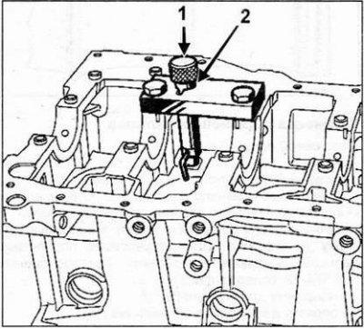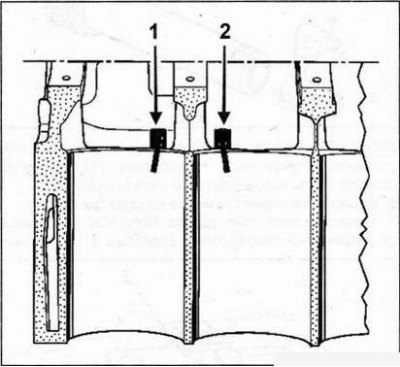 8. Праверце, ці правільна арыентаваны фарсункі для ахаладжэння дн поршняў. Пазнака (1) адпавядае фарсункам цыліндраў 2 і 4, пазнака (2) адпавядае фарсункам цыліндраў 1 і 3.