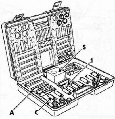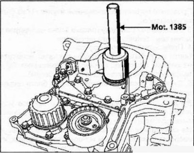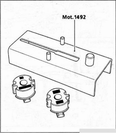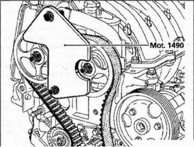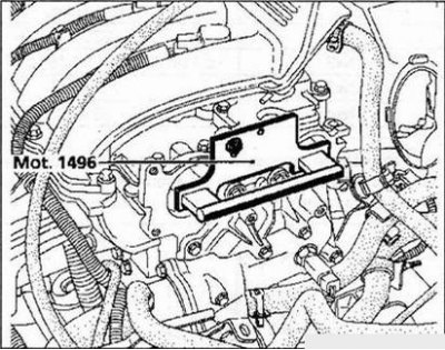 2. Укруціце фіксатар становішча ВМТ Mot. 1489 у блок цыліндраў, усталюеце і ўтрымлівайце каленчаты вал у становішчы, пры якім ён упіраецца ў фіксатар становішча. 3. Усталюйце (не прыкладаючы намаганняў) прынада Mot. 1496 для правільнай усталёўкі размеркавальных валаў (канаўкі размеркавальных валаў павінны займаць гарызантальнае становішча). Калі паказанае прыстасаванне не ўваходзіць у зачапленне, тое гэта азначае, што фазы газаразмеркавання трэба ўсталяваць зноўку і зноў адрэгуляваць нацяжэнне рамяня.
