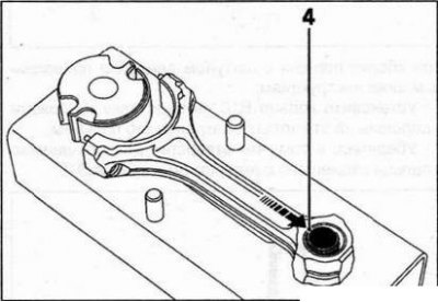 3. Пакладзіце шатун на падставу (як паказана на малюнку). Упэўніцеся ў тым, што ніжняя частка (4) поршневай галоўкі шатуна датыкаецца з усталявальным штыфтам.