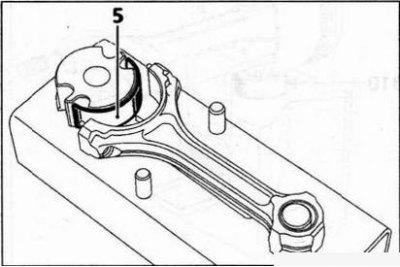 5. Пхайце трымальнік укладыша ў кірунку, якое паказана на малюнку стрэлкай датуль, пакуль трымальнік укладыша не зойдзе да ўпора ў цела шатуна.