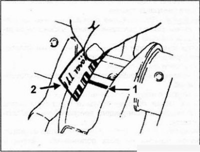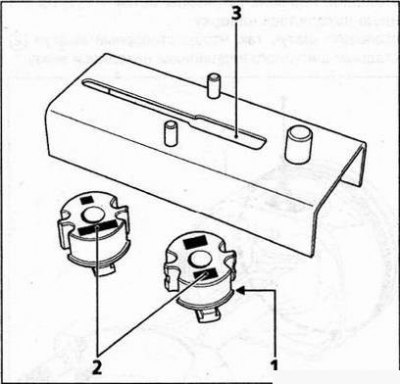 1. Абярыце адпаведны рухавіку трымальнік укладыша (1) (гл. маркіроўку тыпу рухавіка (2) на трымальніку).