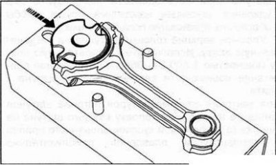 2. Пхайце трымальнік укладыша ў кірунку, якое паказана на малюнку стрэлкай, датуль, пакуль трымальнік укладыша не зойдзе да ўпора ў вечка кривошипной галоўкі шатуна.