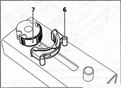 1. Усталюйце вечка кривошипной галоўкі шатуна на выступы (6) падставы, а затым змесціце на трымальнік укладыш (7).