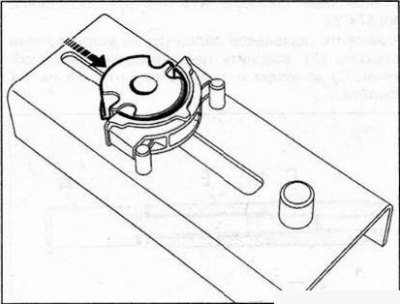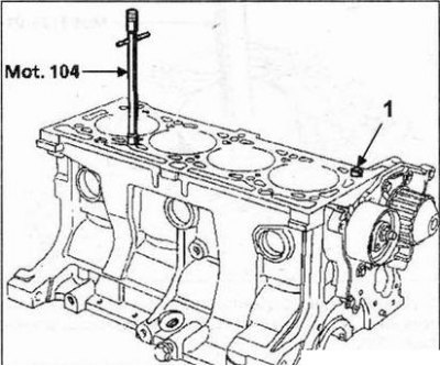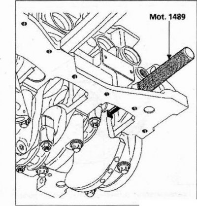 1. Правярніце каленчаты вал па гадзіннікавай стрэлцы (з боку газаразмеркавальнага механізму) на два абароту; да канца другога абарачэння укруціце фіксатар Mot. 1489 у блок цыліндраў і павольна, без рыўкоў, дакруціце каленчаты вал у тым жа кірунку, пакуль ён не ўпрэцца ў фіксатар становішча ВМТ.