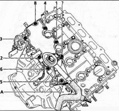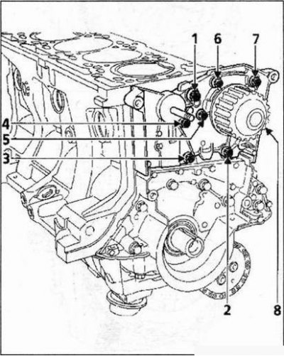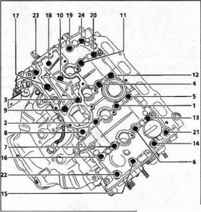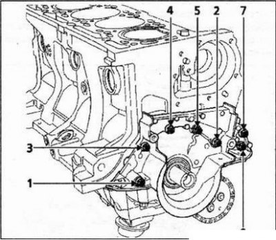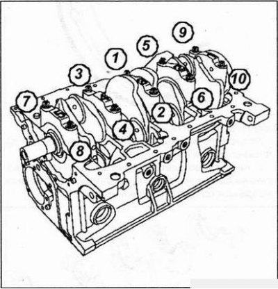 Усталюеце вечкі карэнных падшыпнікаў каленчатага вала (яны пазначаныя лічбамі ад 1 да 5), усталяваўшы вечка са боку махавік. Зацягніце крапежныя ніты ў парадку, паказаным на малюнку, з момантам 25 Нм і дакруціце іх на 47°±5°.