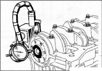 5. Праверце восевы зазор каленчатага вала, які павінен быць у межах 0,045 - 0,252 мм у адсутнасць зносу рэгулявальных паўкола і ў межах 0,045 - 0,852 пры наяўнасці іх зносу.