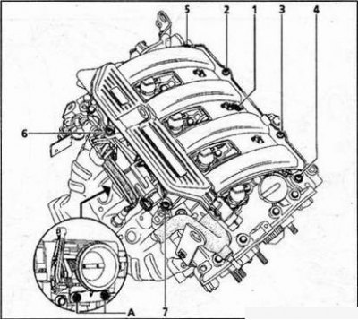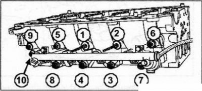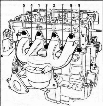 - впускной калектар (з новымі ўшчыльненнямі), зацягнуўшы балты яго мацавання з момантам 9 Нм у рэкамендаванай паслядоўнасці;