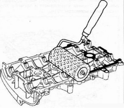13. З дапамогай валіка вырабіце герметык Loctite 518 на паверхню вечка галоўкі блока цыліндраў на боку яе пракладкі, пакуль яна не набудзе чырванаваты колер.
