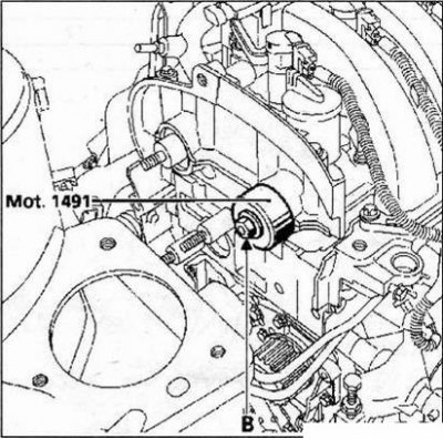 5. Усталюеце зубчастыя шківы размеркавальных валаў так, каб лагатып "Renault" на іх спіцах быў арыентаваны вертыкальна ўгару. Надзеньце прывадны рамень газаразмеркавальнага механізму на зубчастыя шківы размеркавальных валаў і затым усталюеце прынаду Mot. 1490 для блакіроўкі шківаў размеркавальных валаў.