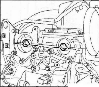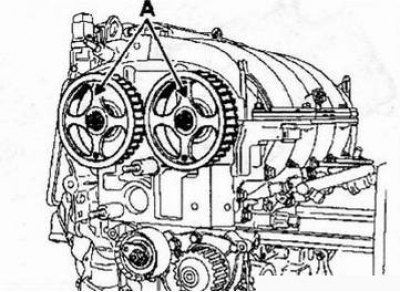 12. Правільна ўсталюеце размеркавальныя валы на свае месцы (гл. падраздзел "Размеркавальныя валы" раздзела "Разборка рухавіка"). Усталюйце пазы размеркавальных валаў, як паказана на малюнку ніжэй.