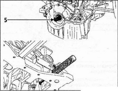 4. Пераканайцеся ў тым, што каленчаты вал упіраецца ў фіксатар становішча ВМТ (пры гэтым канаўка (5) на каленчатым вале знаходзіцца ў самым верхнім становішчы).