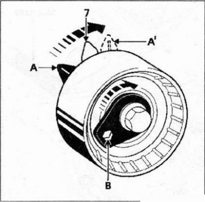 7. Сумясціце рухомую пазнаку (А') з нерухомай пазнакай (7) і зацягніце гайку роліка з момантам 27 Нм.