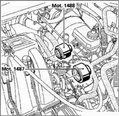 12. Зніміце прынаду Mot. 1496 для правільнай усталёўкі размеркавальных валаў, прынада Mot. 1490 для блакіроўкі шківаў размеркавальных валаў і фіксатар становішча ВМТ Mot. 1489.