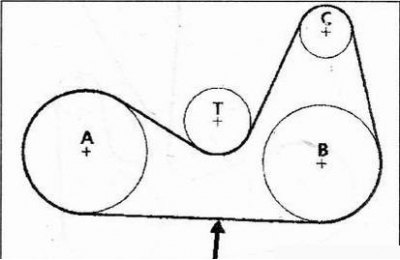 А - Шків каленчатага вала, У - Шків кампрэсара кандыцыянера, З - Шків генератара пераменнага току, D - Шків помпы ўзмацняльніка рулявога кіравання, Е - Абводны ролік, Т - Нацяжны ролік.